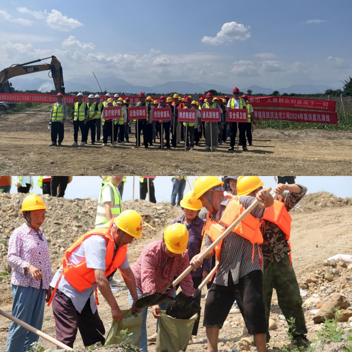 隨著警報響起,演練正式開始。此次演練模擬場景為汛期突然強降雨導(dǎo)致洪水暴發(fā),項目作業(yè)區(qū)域出現(xiàn)險情。安全員立即向值班領(lǐng)導(dǎo)報告,汛期總指揮宣布啟動應(yīng)急預(yù)案。搶險救援隊趕赴現(xiàn)場后“兵分兩路”,一組迅速疏散現(xiàn)場人員,對周邊實行警戒,組織指揮交通,確保救援道路暢通;另一組裝運沙袋、加固土坡控制險情,并組織裝載機、推土機修復(fù)便道恢復(fù)交通,保證撤離路線暢通。最后待水情得到控制后,采取全要素方式,快速收攏人員,集結(jié)隊伍,迅速整編裝備,人員與搶險機械全部撤離。
